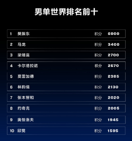 莫雷加德、林昀儒、张本智和、约克奇、奥恰洛夫和德国华裔选手邱党排名在第五到第十位。