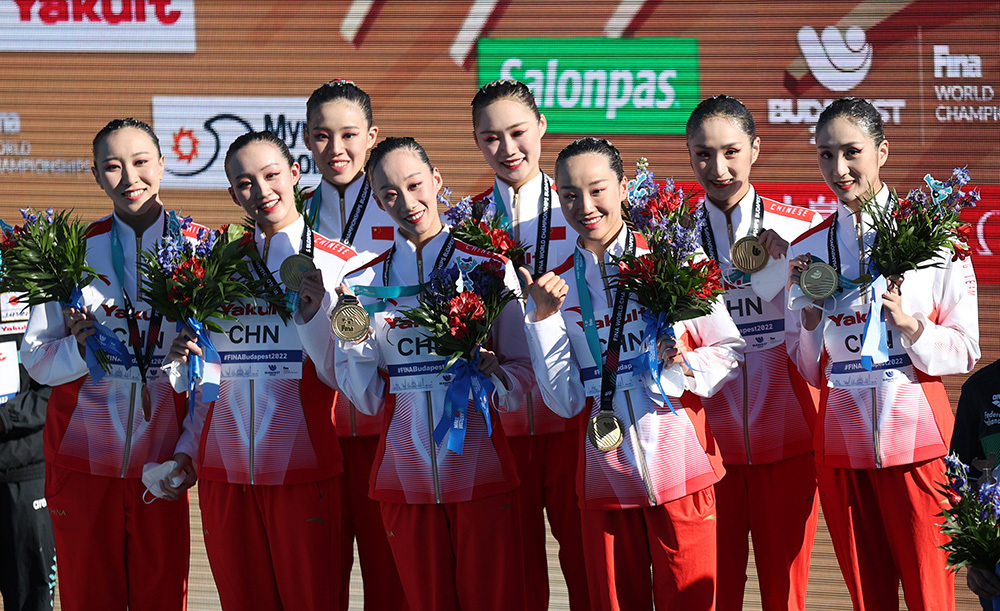 继25岁孪生姐妹花王柳懿/王芊懿摘得布达佩斯游泳世锦赛花样游泳双人技术自选金牌、石浩玙/张依瑶摘得混双技术自选铜牌后,中国花样游泳再次在布达佩斯创造新的历史。6月21日,中国花样游泳队以94.7202分摘得集体技术自选的金牌,为中国队拿到本届世锦赛的第二金。