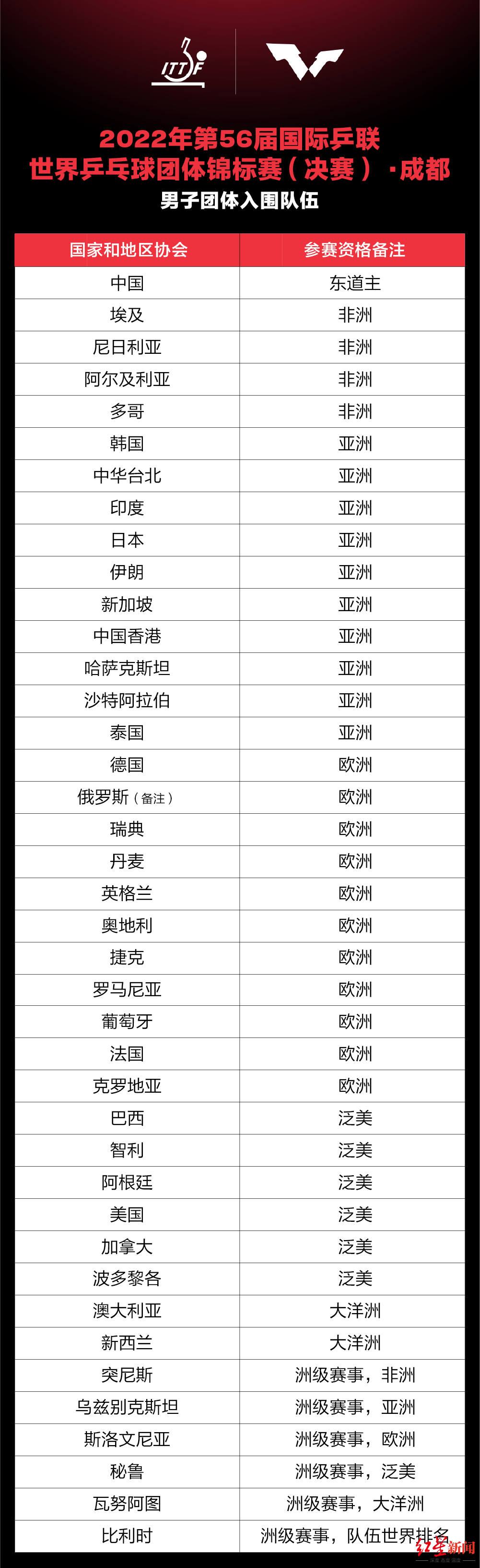 国际乒联公布入围队伍