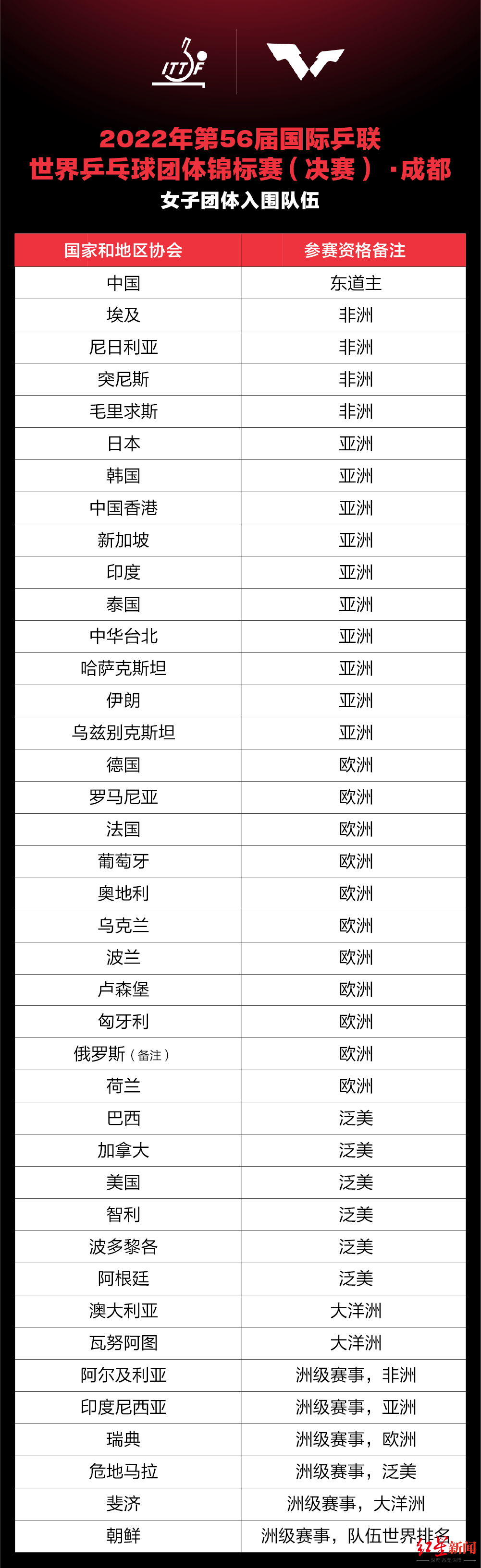 (备注)2022年3月1日,根据国际奥委会执行委员会的建议,国际乒联执行委员会决定:不允许俄罗斯、白俄罗斯运动员和官员参加当前的国际乒联赛事。如果该禁令的持续时间持续并且覆盖到2022年成都世乒赛团体赛开赛之日(即开赛后),俄罗斯男队和女队的参赛席位将由下一位符合条件的队伍替代。