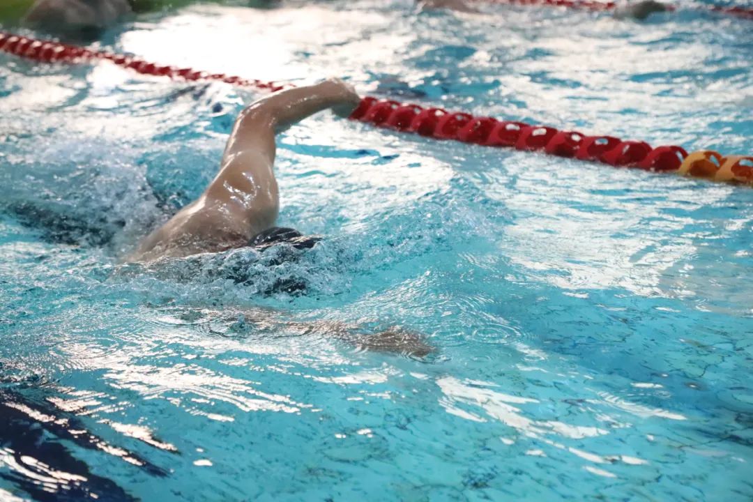游泳馆内,运动员们随着一声令下,拨边、蹬腿、前冲,从跳台上飞跃而出,如游鱼一般穿水而入,激起一朵朵水花,体现了运动员们奋勇拼搏、昂扬向上的精神面貌。