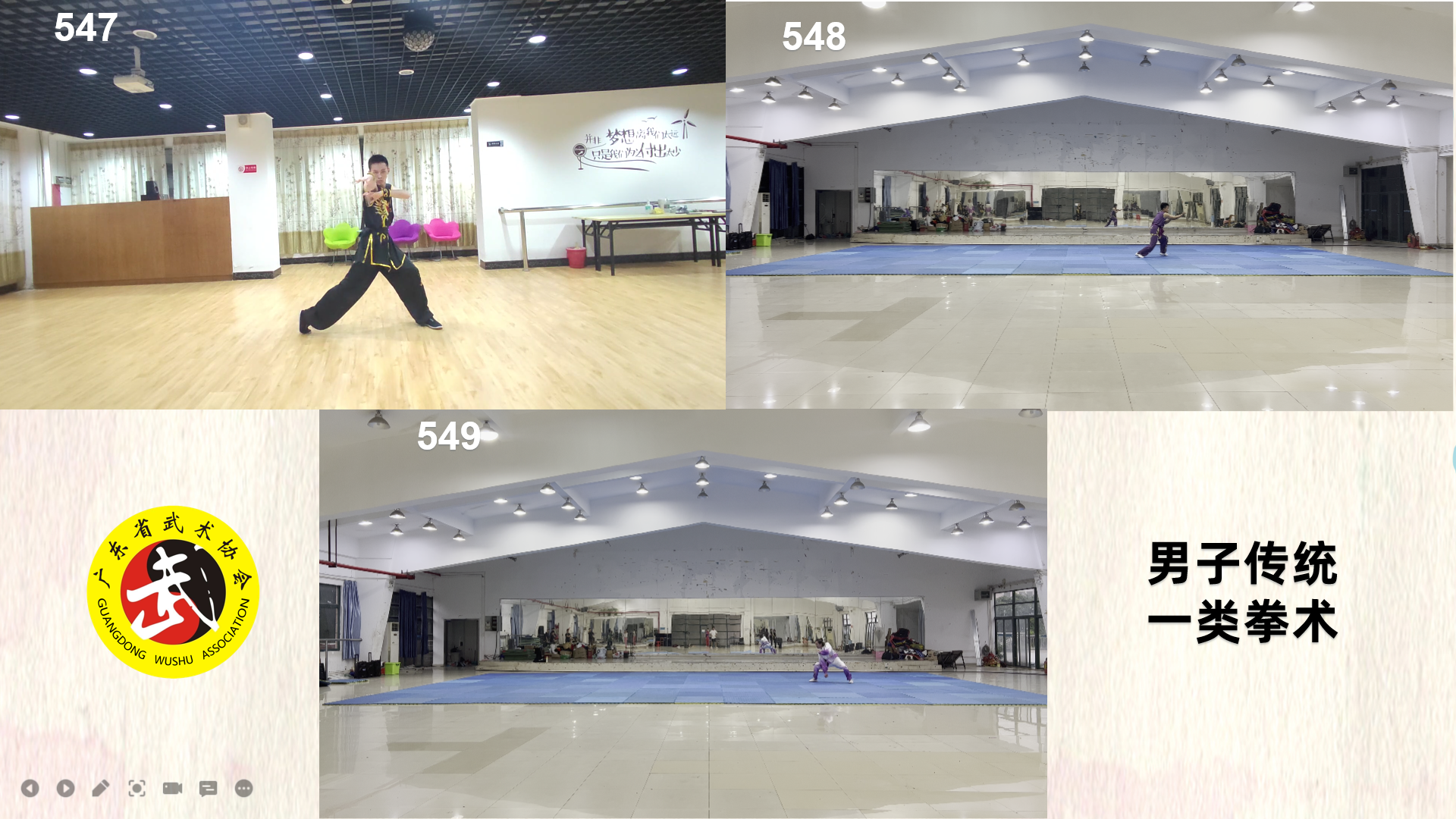 赛事共分为大学、高中、初中、小学各男女组别,比赛项目参考全国武术馆校赛规范设置,设有规定器械与拳术、传统器械与拳术、本校特色个人/集体项目,并增加了广东南拳段位制套路等项目。参赛选手以视频录制的形式进行套路演练,组委会统一收集和整理参赛视频,并在广东省武术协会的指导和组织下,邀请裁判员集中线下对参赛视频进行评分,评比过程全程视频直播。线上比武的赛事模式得到了参赛单位的一致好评,既满足了各馆校学生的赛事需求,同时在疫情防控常态化的情况下,用有别于传统办赛的方式有序开展了社会体育赛事活动。