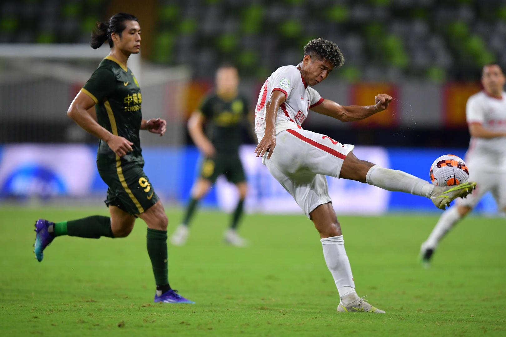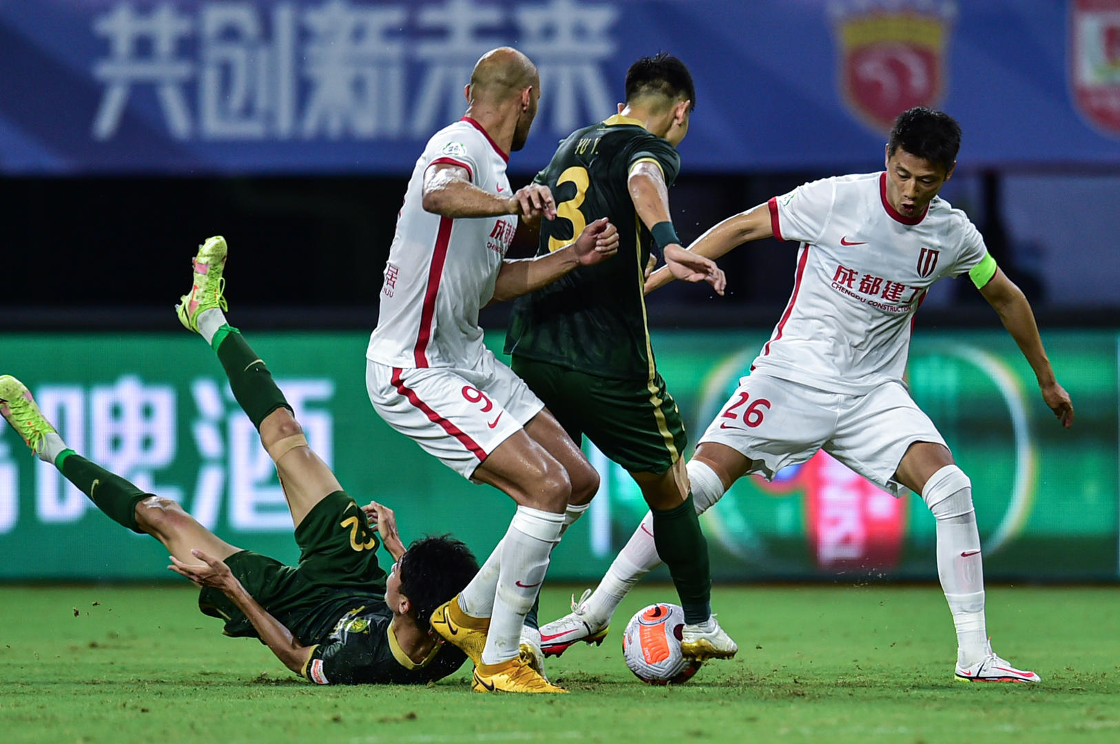成都蓉城和北京国安的第二次交手,两队并没有如外界想象的那样,一开场就分外眼红,从而刺刀见红。两队反而都采取了较为谨慎的态度,时间在相互试探中不断流逝。前三十多分钟,两队射门寥寥,场面显得极为平淡。第34分钟,成都蓉城开出战术角球,甘超在禁区前得球后远射,北京国安门将侯森双拳将球击出,金敃友在禁区内补射又打在对方后卫的头上弹出。2分钟后,成都蓉城在前场左路获得任意球,罗慕洛的传球找到了中卫温德比希勒,但后者的甩头攻门偏出。而这已经算是上半场比赛比较精彩的几分钟了,从中也可以看出两队但求无过的态度以及炎热、疲劳对球员带来的影响。