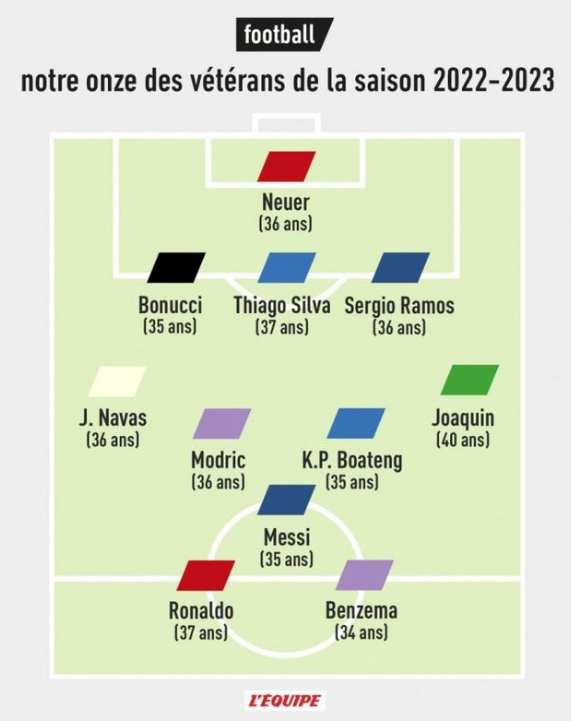 老兵不死,只是会逐渐凋零。近日,知名法国媒体《队报》评选出了目前世界足坛最佳“老兵”11人阵容,阵型为343,其中C罗、梅西和本泽马领衔锋线,莫德里奇坐镇中场,拉莫斯主导后防,诺伊尔镇守城关,而大部分球员依旧还是各自俱乐部的当家主力。