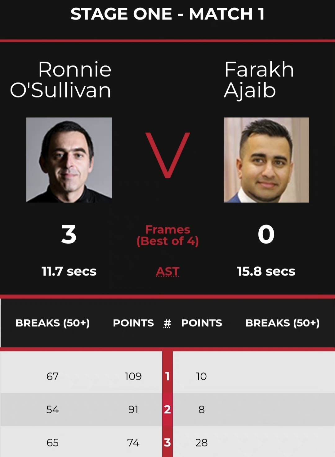 2022-2023赛季,斯诺克冠军联赛先行赛出8个小组第一后,时隔两日,北京时间7月4日19时,赛事再启,结果众望所归的火箭奥沙利文,新赛季首度亮相,身手依旧,出手不凡,用时颇短,随心所欲,轻描淡写,直下三城,速战速决,3:0完胜实力一般般的菲拉克-阿贾博,三局比分为109:10、91:8、74:28,三局分别轰出3记单杆50加,平均出杆11.7秒,整场胜出,实力上乘,不费吹灰之力,可谓王者归来。