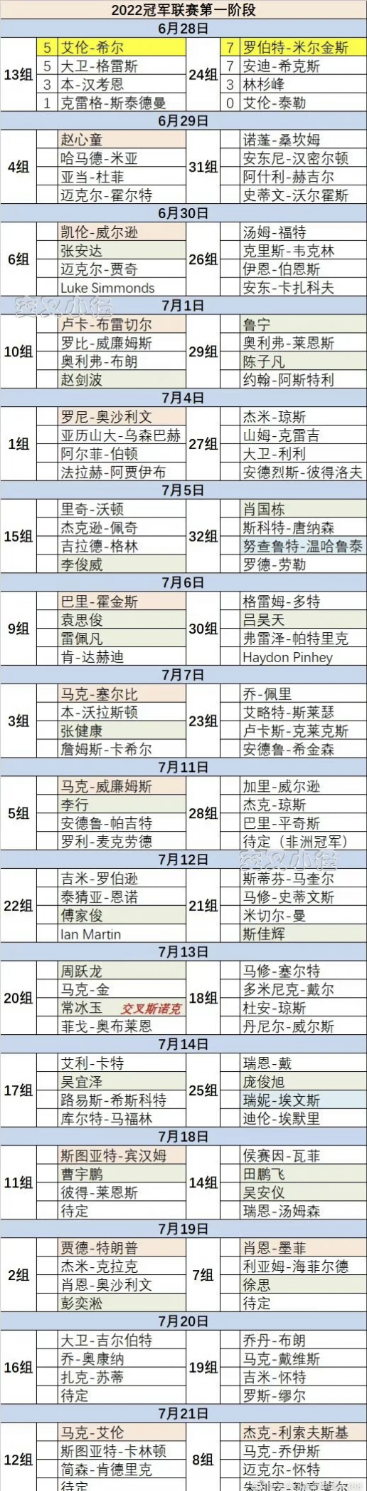 本次冠军联赛,火箭位列第1小组,同组的有菲拉克-阿贾博、阿尔菲-伯顿、尤森巴赫,本组选手中,火箭现排名世界第一,其次是尤森巴赫排名第58位、阿尔菲-伯顿排名第94位,至于阿贾博无排名,实为业余选手。