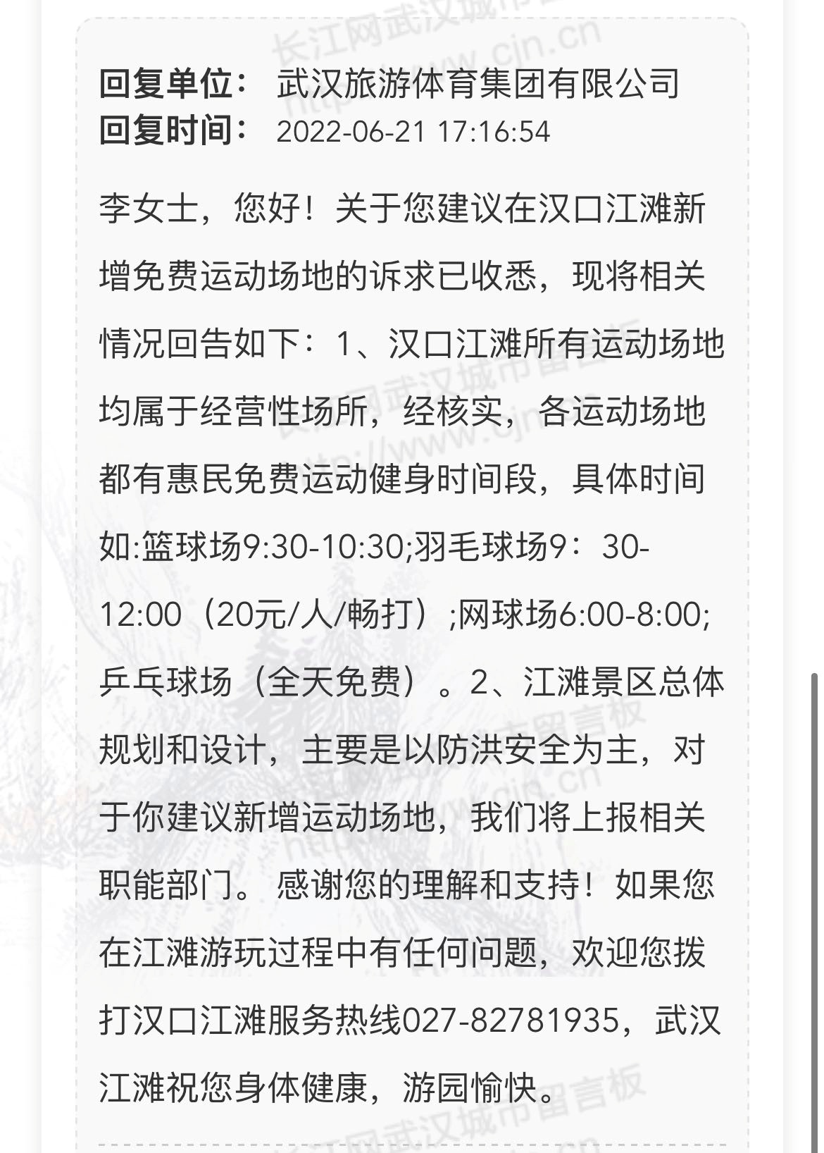 武汉旅游体育集团有限公司回复:关于您建议在汉口江滩新增免费运动场地的诉求已收悉,现将相关情况回告如下:1.汉口江滩所有运动场地均属于经营性场所,经核实,各运动场地都有惠民免费运动健身时间段,具体时间如:篮球场9:30—10:30;羽毛球场9:30—12:00(20元/人/畅打);网球场6:00—8:00;乒乓球场(全天免费)。2.江滩景区总体规划和设计,主要是以防洪安全为主,对于你建议新增运动场地,我们将上报相关职能部门。