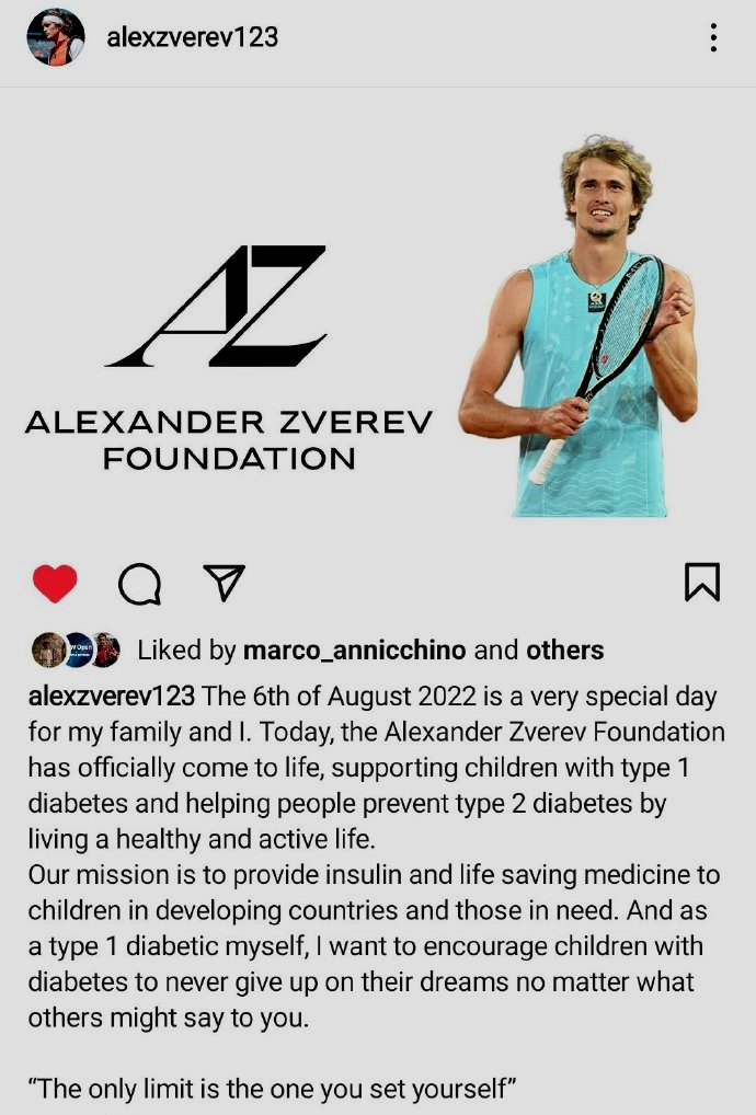 我们再来看一条有关小兹维列夫的消息。北京时间昨晚,正在养伤的世界第二在个人社交媒体上宣布,成立亚历山大-兹维列夫基金会,致力于为确诊糖尿病的孩子提供帮助,并为发展中国家的糖尿病患者提供药物治疗。 小紫薇同时透露,他自己也是糖尿病患者。“作为一名1型糖尿病患者,我想鼓励患有糖尿病的儿童永远不要放弃他们的梦想,无论别人对你有何评论。唯一的限制是你自己设定的限制。”德国人表示,此前很少有人知道他患有糖尿病,他也不想让外界知晓。但如今他放下了心理包袱,直面现实,并用成立基金会的方式来为社会做贡献。为小紫薇点赞!