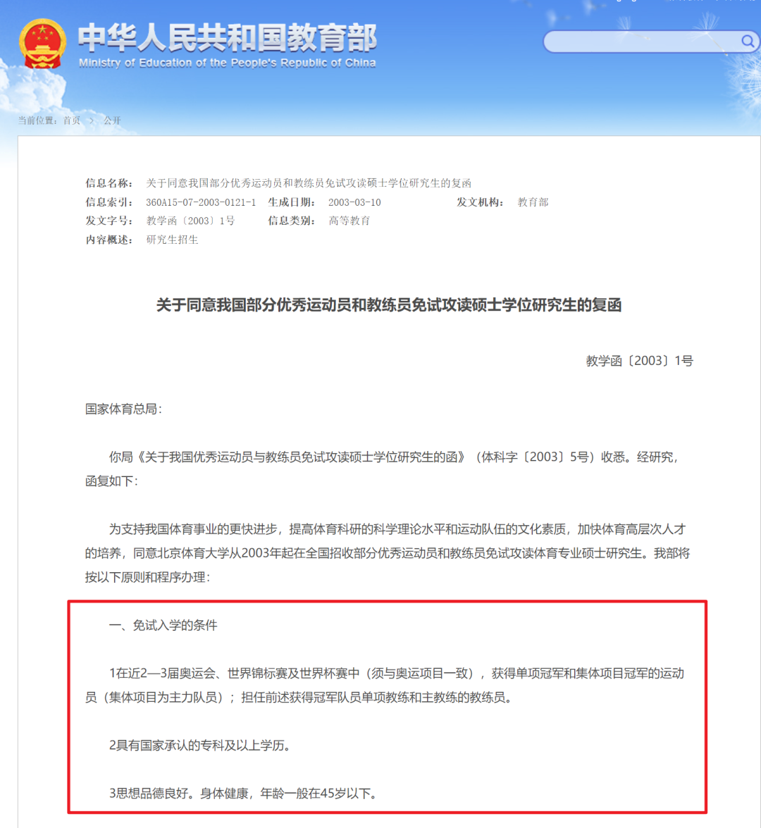 记者注意到,教育部在《关于同意我国部分优秀运动员和教练员免试攻读硕士学位研究生的复函》中公布了相关入学条件: