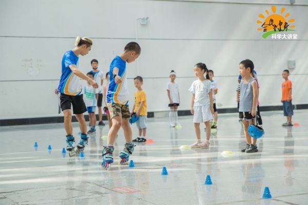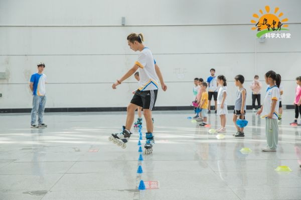 到了现场互动教学环节,场馆变成了欢乐的室内旱冰场。从基础的外八字站立、蹲下起立、安全摔倒,到入门的平行站立、横向跨步、V字滑行,再到进阶的交叉跨步、画弧滑行,小朋友们在教练的带领下,默默铆足劲开始比拼。即使不小心摔跤,也会马上安全起立,笑着继续滑行。这一刻,孩子们尽情享受了轮滑飞扬的魅力。