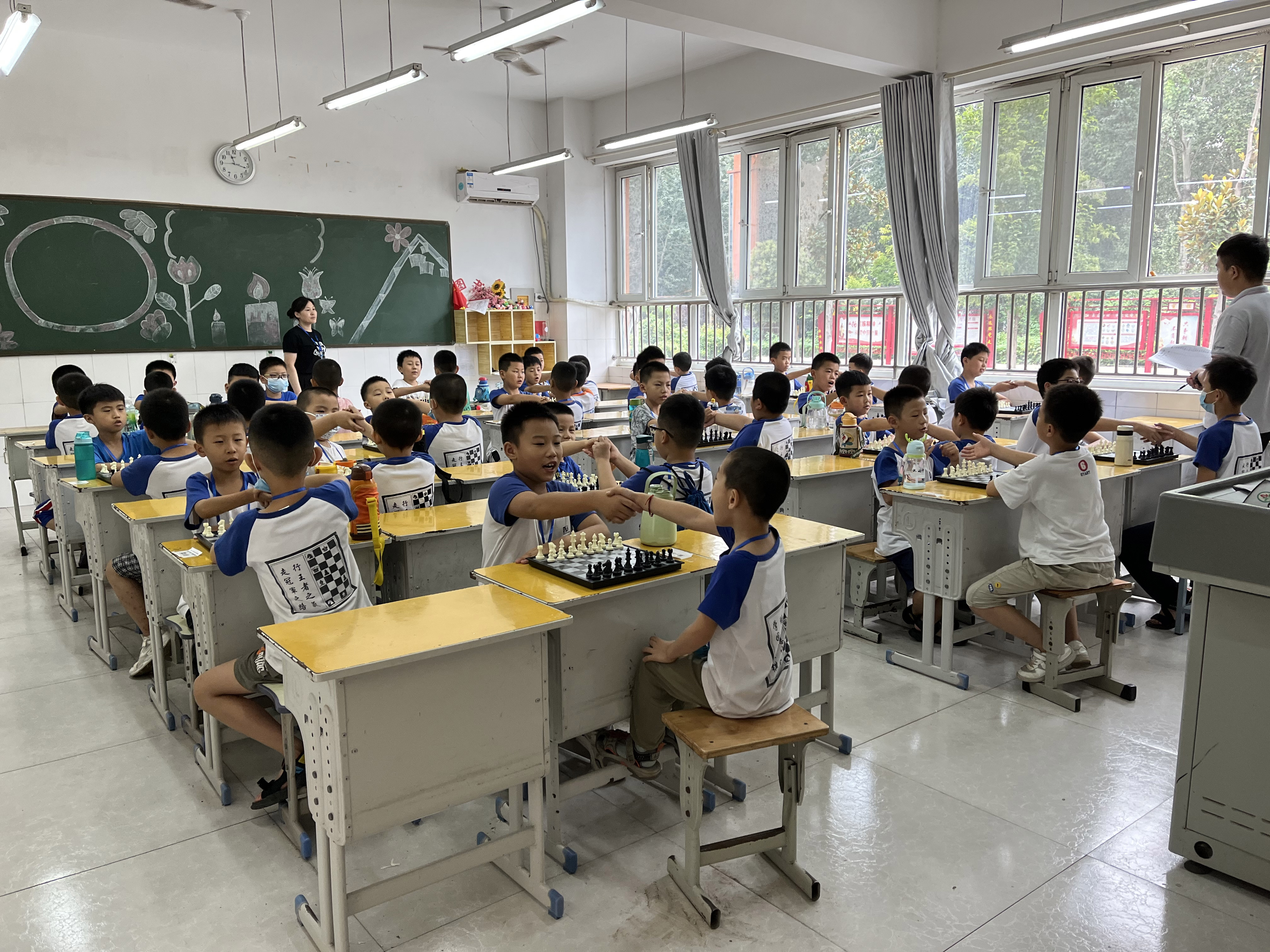 本次比赛深受广大学生和家长欢迎,近400名运动员参加比赛。根据报名运动员的情况,本次比赛共分为15个组进行。各组全部采用7轮瑞士制竞赛,电脑编排。选手们在裁判引导下,走进教室各就各位,认真开始比赛。小选手们心无旁骛,很快进入比赛状态,沉着应战。