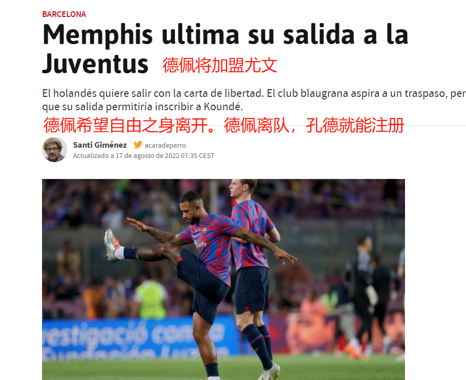 孟菲斯-德佩即将离开巴萨,加盟尤文图斯。8月17日,《世界体育报》和《阿斯报》等媒体纷纷确认,德佩与尤文达成协议,荷兰前锋将签约2年,拿到600万欧元的税后年薪。如果转会成行,对德佩、尤文、巴萨来说,这是一桩三赢交易。