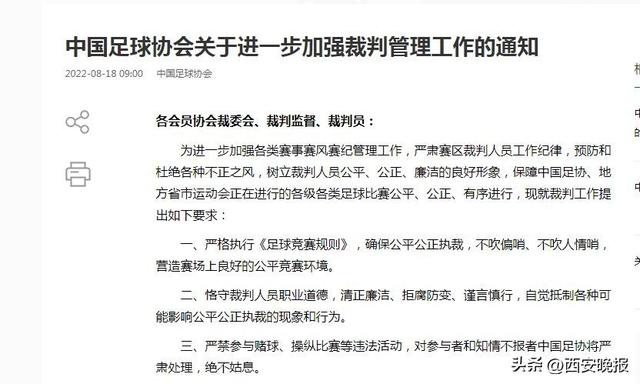 18日,中国足协网站发布《中国足球协会关于进一步加强裁判管理工作的通知》。通知要求,裁判人员严禁参与赌球、操纵比赛等违法行为,保障中国足协、地方省市运动会正在进行的各级各类足球比赛公平、公正、有序进行。