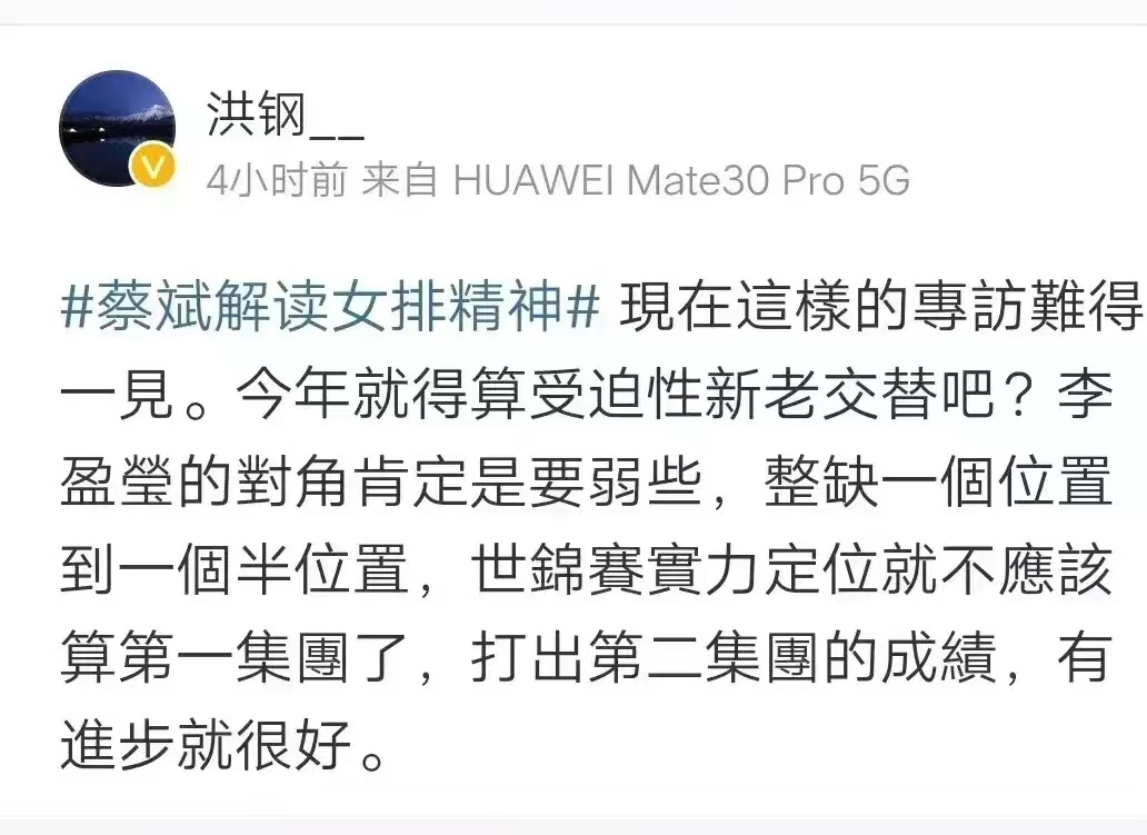 洪钢写道:“现在这样的专访难得一见。今年就得算受迫性新老交替吧?李盈莹的对角肯定是要弱些,整缺一个位置到一个半位置,世锦赛实力定位就不应该算第一集团了,打出第二集团的成绩,有进步就很好。”