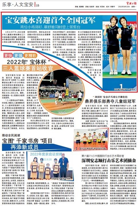 8月21日下午,2022全国少年儿童跳水锦标赛在江门市游泳跳水馆落幕,宝安区跳水队输送的郑好、覃舒雅两位小将在比赛中发挥出色,分获女子跳台冠军和季军。郑好也成为宝安跳水项目首位在全国赛事中夺冠的选手。