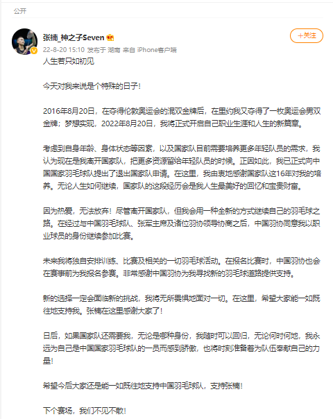 20日,羽毛球运动员张楠宣布退出国家队,之后将以职业球员身份继续参加比赛。张楠写道:“考虑到自身年龄、身体状态等因素,以及国家队目前需要培养更多年轻队员的需求,我认为现在是我离开国家队,把更多资源留给年轻队员的时候。未来我将独自安排训练、比赛及相关的一切羽毛球活动。” 张楠现年32岁,他曾夺得伦敦奥运会羽毛球混双冠军和里约奥运会羽毛球男双冠军。
