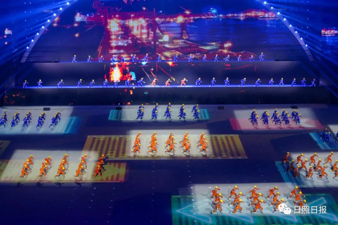 光影流转,场地瞬间变换为日照港集装箱码头一派虎虎生威、生龙活虎的生产景象。产业工人以坚实有力、豪迈热烈的舞蹈,努力在新征程上跑出“加速度”。