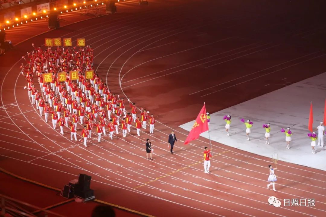 开幕式上,各市体育代表团依次入场,当主持人喊出“日照市体育代表团”的名字,看台上,欢呼声喝彩声,一片欢腾。看台下,运动员们一边挥舞着国旗和会旗,一边热情挥手回应观众。