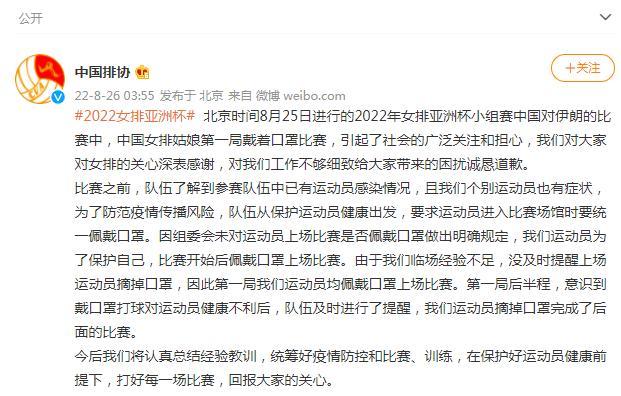 北京时间8月25日,菲律宾,2022年女排亚洲杯小组赛中国对伊朗的比赛中,中国女排姑娘戴着口罩上阵的一幕,引来争议。“中国女排戴口罩”上了热搜。26日,中国排协予以回应:对大家对女排的关心深表感谢,对我们工作不够细致给大家带来的困扰诚恳道歉。这个回应较为及时地回应了球迷的关切,在一定程度上安抚了人心。