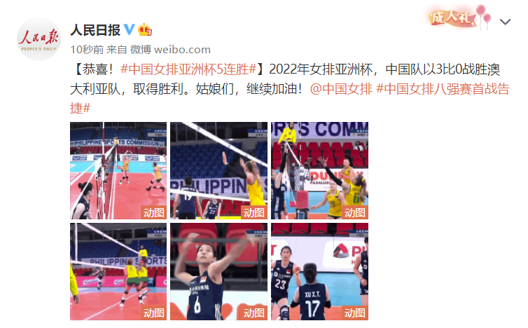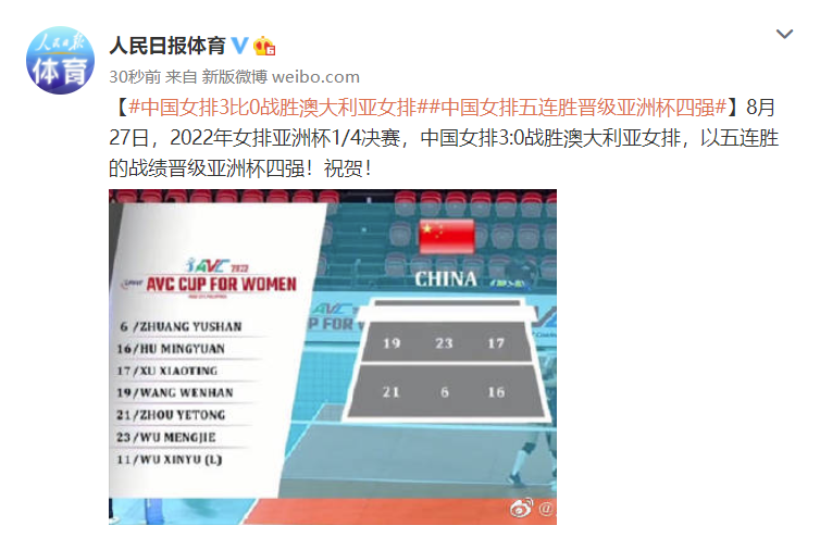 2022年女排亚洲杯,北京时间8月27日下午,中国女排与澳大利亚队进行1/4决赛争夺。中国女排在这场比赛中发挥稳定,三局比赛都以大比分优势获胜,以总比分3-0横扫澳大利亚队,斩获五连胜的同时也拿到四强席位。