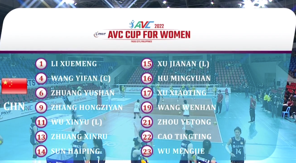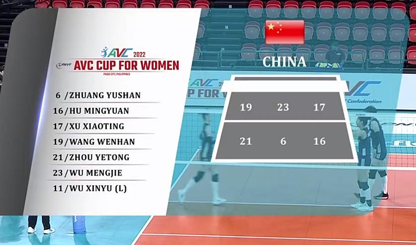 中国女排首发:6-庄宇珊,23-吴梦洁,16-胡铭媛,19-王文涵,21-周页彤,17-许晓婷,11-武欣宇。