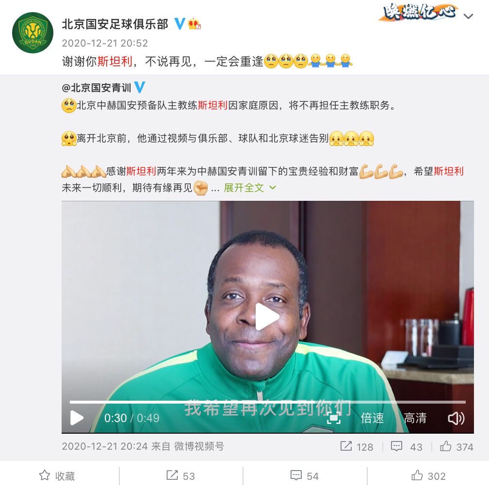 2020年12月离开北京前,斯坦利通过视频向俱乐部和北京球迷道别,荷兰人指着胸前的国安队徽字正腔圆地说:“国安国安,北京国安。”