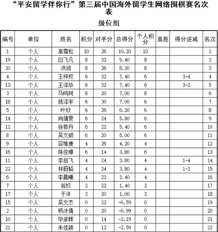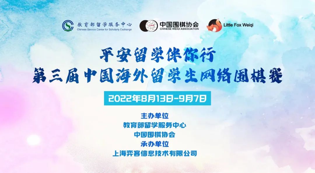 8月30日,由教育部留学服务中心、中国围棋协会联合主办,弈客围棋承办的“平安留学伴你行”第三届中国海外留学生网络围棋赛级位组最后一轮比赛结束,就读于美国戴顿大学的高雪松5轮全胜获得冠军,捷克理工大学的白飞凡、加拿大滑铁卢大学的洪润分获二、三名。