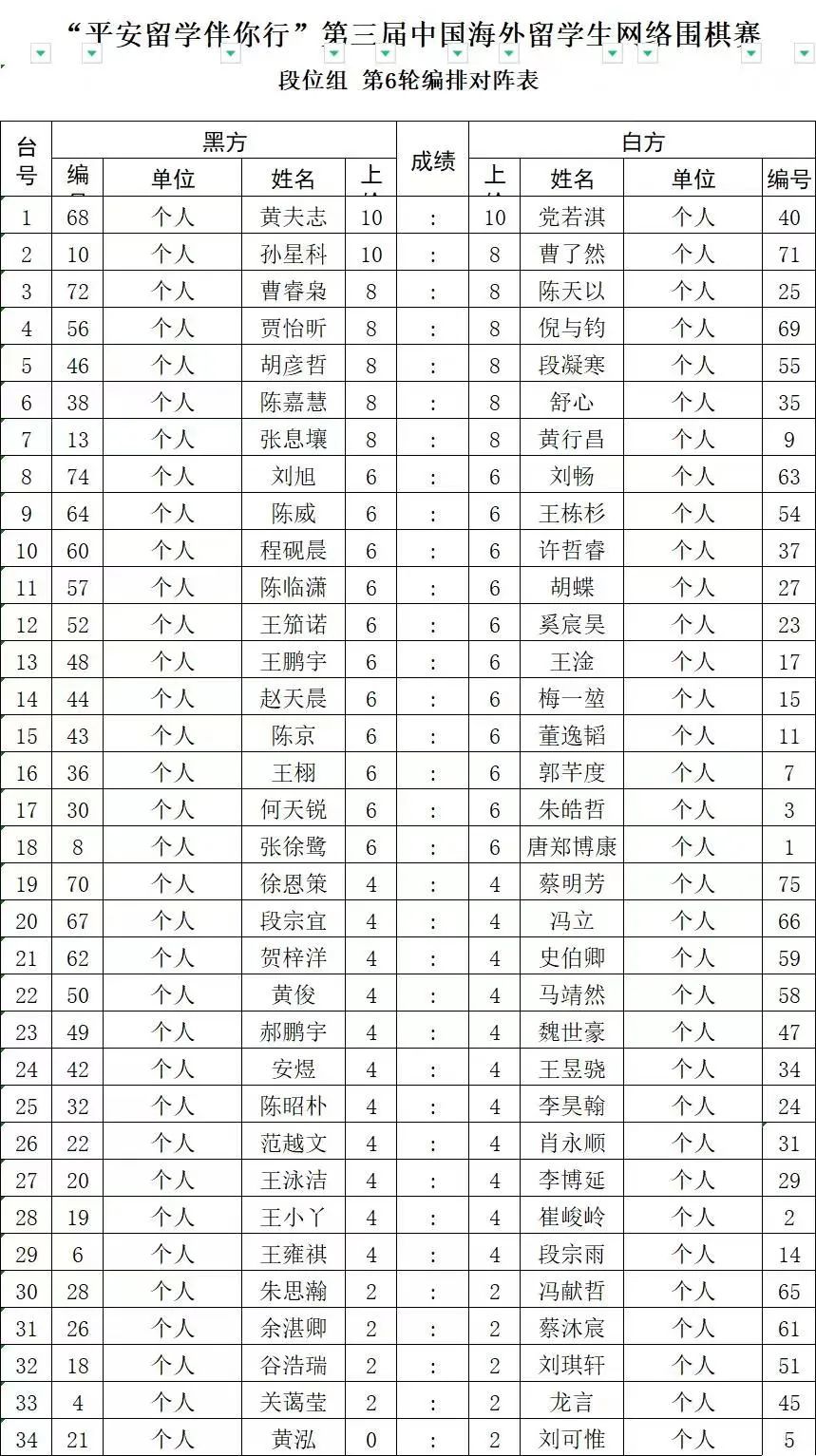 目前,段位组比赛仍在继续,已进入白热化阶段。5轮过后,来自澳大利亚新南威尔士大学的黄夫志、新加坡南洋理工大学的党若淇、美国威斯康星大学麦迪逊分校的孙星科保持不败积10分,另有11名棋手4胜1负积8分。最后两轮比赛将分别于9月2-3日,9月6-7日进行。