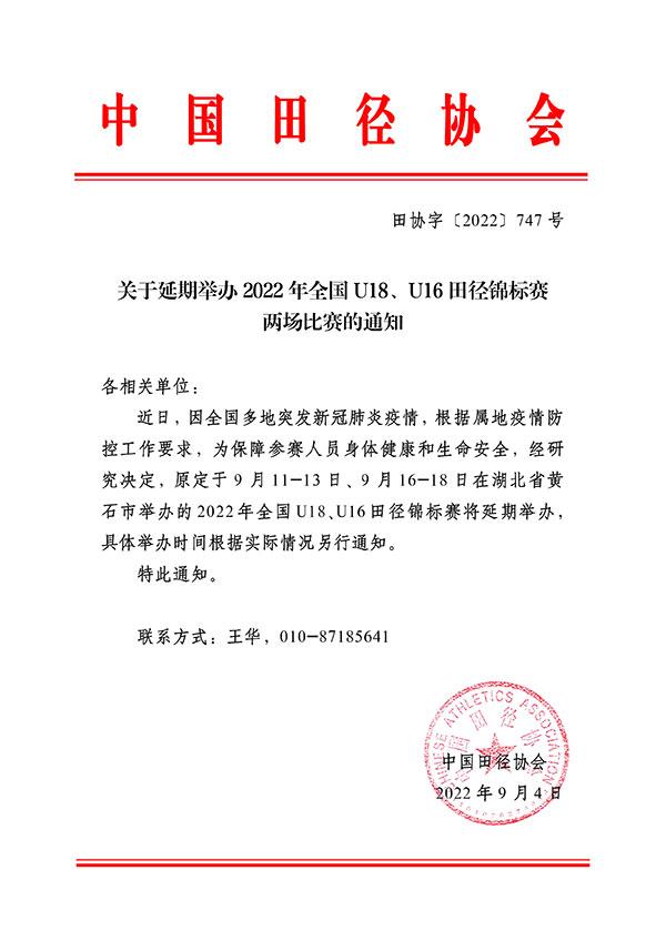 中国田协表示,为保障参赛人员身体健康和生命安全,经研究决定,原定于9月11-13日、9月16-18日在湖北省黄石市举办的2022年全国U18、U16田径锦标赛将延期举办,具体举办时间根据实际情况另行通知。