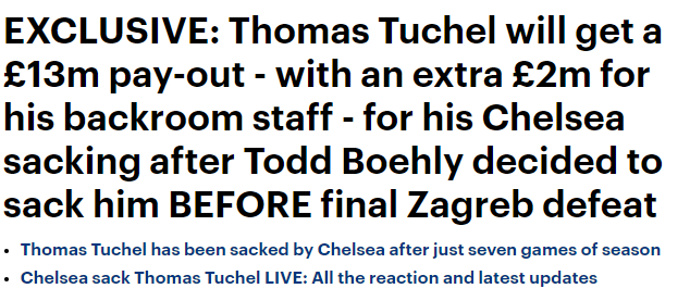 9月7日,切尔西官方宣布,一线队主帅图赫尔被解雇。欧冠小组赛首轮,切尔西0-1爆冷负于萨格勒布迪纳摩,这是导致图赫尔下课的直接原因。切尔西解雇图赫尔,也花了不小的代价,《每日邮报》独家消息称,切尔西将赔偿1300万英镑的违约金。