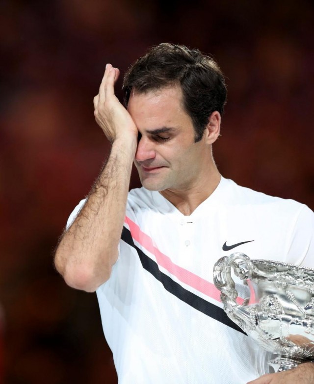 费德勒含泪怀抱2018年澳网男单冠军奖杯,这也是他职业生涯第20个大满贯冠军。新华社记者白雪飞 摄
