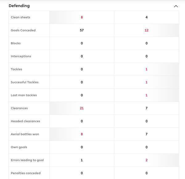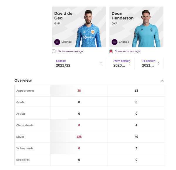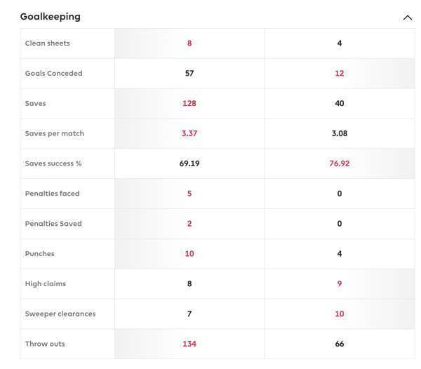 首先是截止到现在的英超比赛中,鸭子和小亨的数据表现,可以看出被入球数8-17,,扑救数18-29,面对点球数0-2,场均扑救数3-4.14,其中德赫亚被入的8球,6球出自奇幻的联赛首轮和次轮,而小亨则是稳定的场均3球,再加上2个点球(虽然被扑),这个可以说是这个赛季同样豪掷千金的曼联和诺丁汉森林之间后防质量差异的集中展现。
