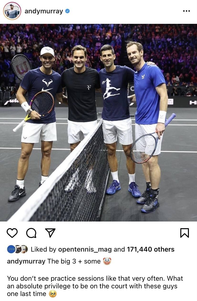 费德勒发文称,自己狂发完快拍后就和朋友们一起去吃晚饭。纳达尔的关注点同样是在商量着吃饭问题。一向幽默感满满的德约科维奇一改常态,对这次的比赛感慨万千。而穆雷的自嘲让人哭笑不得,他调侃合照中的其他三位巨头是“老家伙”,自己是小丑,在拉沃尔杯的赛前训练环节,费德勒、纳达尔、德约科维奇以及穆雷两两配对,进行了男双项目的比拼。