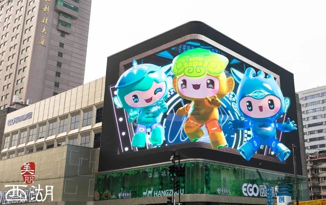 文三路上,“琮琮”“莲莲”“宸宸”这三个小可爱的裸眼3D视频生动展示了足球、帆船、电竞等运动场景,也让亚运吉祥物“活”了起来。