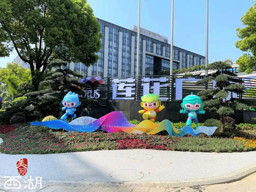 莲花广场作为亚运观赛空间,布置了“亚运与梦想齐飞,杭州与世界同行”“心心相融,@未来”等亚运宣传标幅,高颜值的亚运元素让整个广场亚运氛围满满。