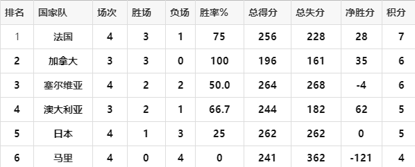 本组的形势还不够明朗,仍存在一定的变数,不过目前已有2支球队提前晋级,另外将有3支球队竞争2个席位。根据积分榜形势可知,法国队和加拿大队皆手握3个胜场,第五名日本队只有1个胜场。还剩1轮比赛的情况下,法国队和加拿大都锁定小组前四,可见这2队皆提前晋级八强。