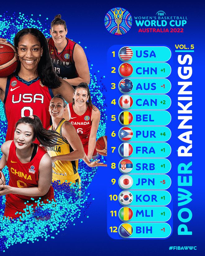 第5期也是最新一期的女篮世界杯实力榜为:1、美国,2、中国,3、澳大利亚、4、加拿大、5、比利时,6、波多黎各,7、法国,8、塞尔维亚,9、日本,10、韩国,11、马里,12、波黑。