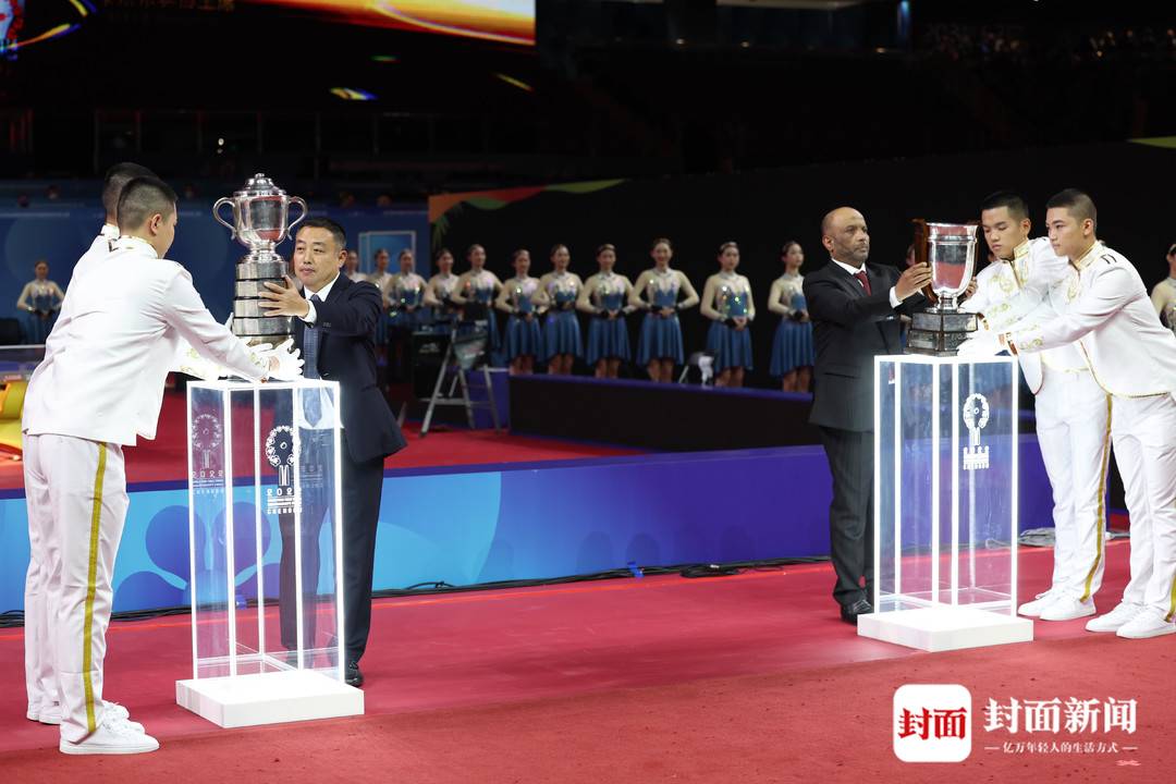 随后,国际乒联执行副主席、WTT世界乒联董事兼理事会主席、中国乒协主席、成都世乒赛团体赛组委会执行主任刘国梁,国际乒联执行副主席、WTT世界乒联董事、亚乒联盟主席、卡塔尔乒协主席卡里尔·阿尔·默罕纳迪共同入场,将世乒赛团体赛男团冠军奖杯斯韦思林杯和女团冠军奖杯考比伦杯放置在开幕式现场的水晶底座之上。接下来的10天时间里,各国乒乓球运动员将向着乒乓球团体最高荣誉发起冲击。