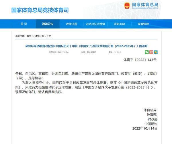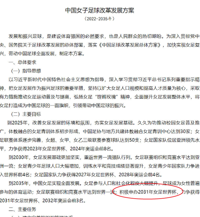 据央视新闻客户端,国家体育总局、教育部、财政部、中国足协24日联合印发《中国女子足球改革发展方案(2022-2035年)》。《方案》按照2025年、2030年和2035年设置了三个阶段的发展目标,《方案》提出,到2035年,中国女足实现全面发展。中国将积极申办2031年女足世界杯,中国女足力争获得2031年女足世界杯、2032年奥运会前3名。