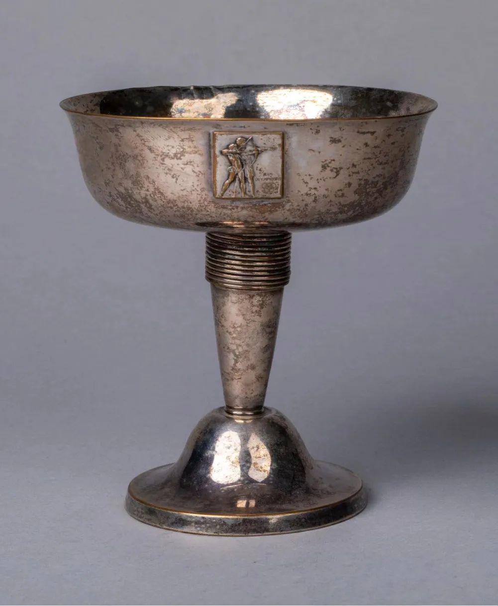 奖杯杯身较为圆润,撇口。杯身中央刻有众神之王宙斯指导一名运动员弯弓射箭的场景,右下方为法语版的“奥林匹克运动会”字样和奥运五环。射箭项目在1924年巴黎奥运会上为表演项目,其优胜者并不授予奥运会金牌,而是授予此奖杯。