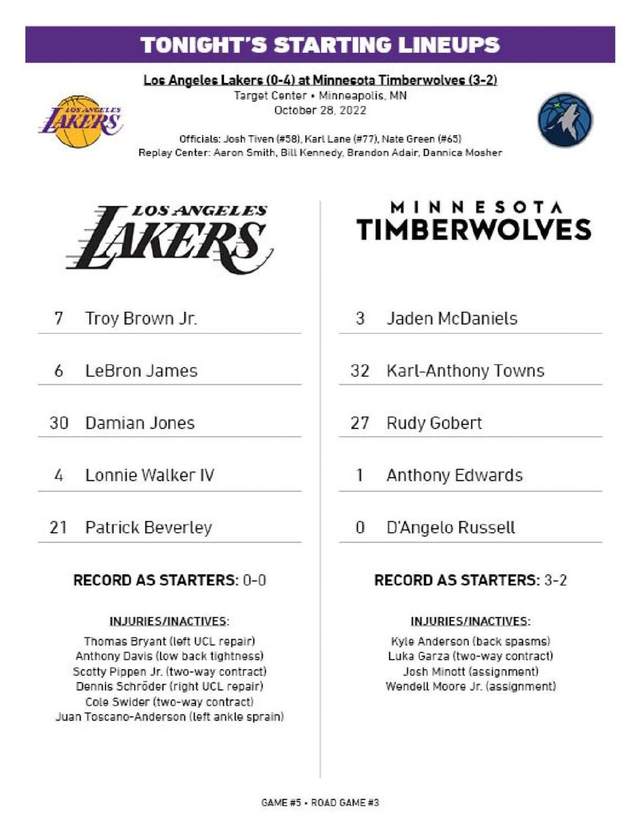 北京时间10月29日,此前已经是常规赛四连败排名西部最后一名的湖人来到明尼苏达挑战目前西部第七的森林狼,此战赛前湖人方面更是传出了浓眉哥伤停的消息,这无疑是让本身阵容深度就不行的湖人变得雪上加霜。森林狼如今有着唐斯、戈贝尔加上爱德华兹以及拉塞尔等明星球员,整体阵容比湖人要豪华了很多。即便湖人这边有着詹姆斯,他们在这场比赛也将占不到什么便宜,而事实证明比赛的过程真的是如此。