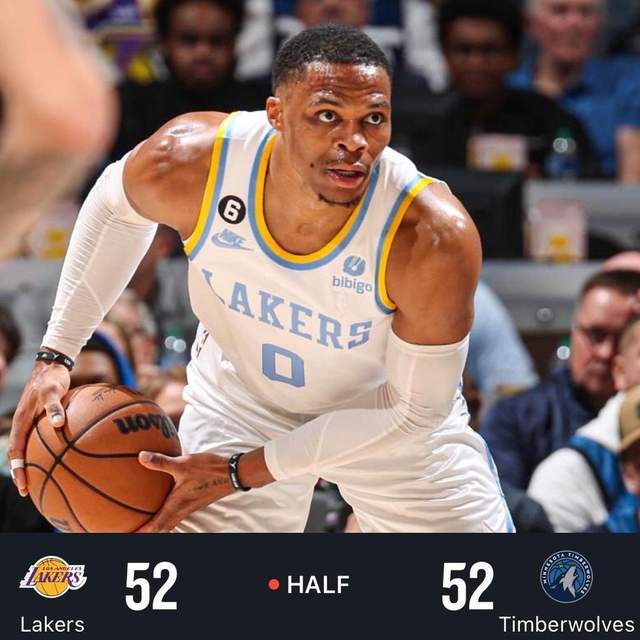 至于来到第二节之后,由于威少本场比赛的状态十分不错,他个人第二节居然单节拿到10分3篮板1次助攻的好数据,还投进了一个弧顶的三分球。在威少的带动下,湖人的整体推进速度快了不少,通过不少快攻完成了简单得分。而森林狼这边只有爱德华兹的状态还不错,唐斯以及拉塞尔等人的手感仍然是没有打开,这让湖人在第二节追平了比分,来到52比52进入到更衣室等待下半场比赛。
