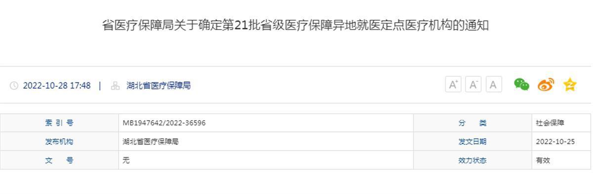 湖北省医疗保障局关于确定第21批省级医疗保障异地就医定点医疗机构的通知