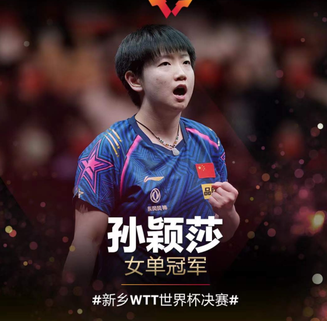 10月30日晚,在河南新乡举行的WTT(世界乒乓球职业大联盟)世界杯决赛结束女单争夺,孙颖莎4比3战胜陈梦摘得冠军。不到一个月,孙颖莎接连拿到了成都世乒赛团体赛、WTT澳门冠军赛和新乡世界杯决赛3个大赛冠军。