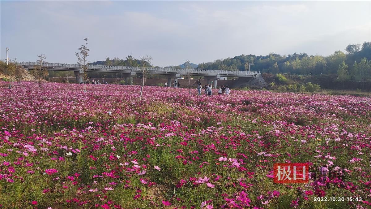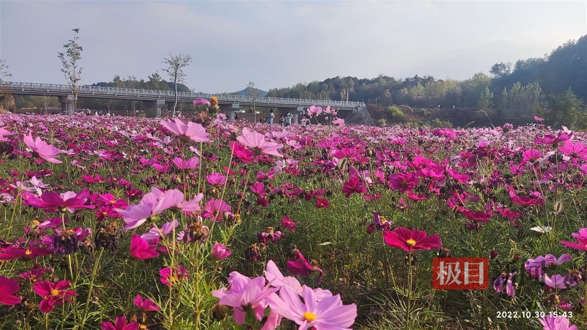 10月30日,在武汉市新洲区道观河风景区红色旅游公路二线的河滩上,一片格桑花开得正艳,娇艳的花朵迎风起舞,美不胜收。过往行人纷纷驻足观赏、留影,享受秋高气爽的美好时光。