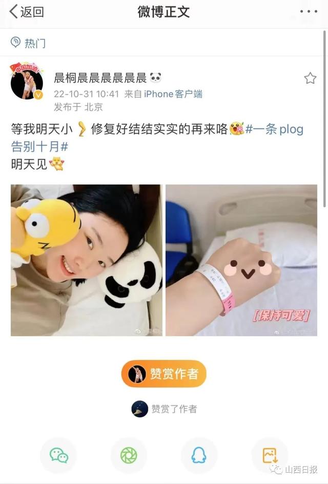 “等我明天小腿修复好,结结实实(地)再来咯~”10月31日,武桐桐在个人社交平台发布晒出自己的住院照片,并透露自己将于次日接受腿部手术。“明天做手术,需要恢复9-10个月不等,所以今年的联赛打不了了。”武桐桐说,自己由于腿部手术无法参与新赛季联赛,但仍会时刻关注山西女篮,为山西女篮加油喝彩。