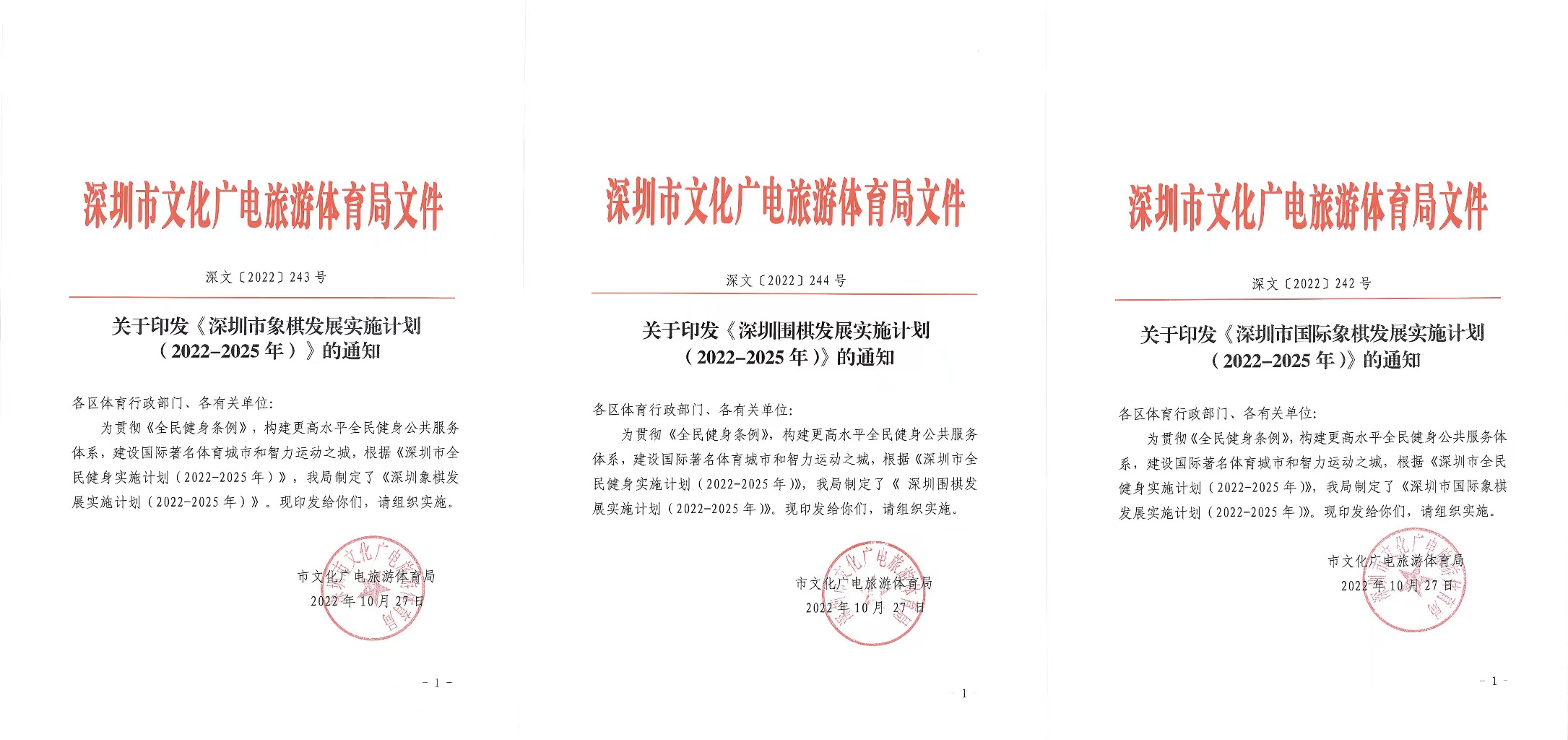 11月3日,深圳市文化广电旅游体育局连续发布《深圳市象棋发展实施计划(2022-2025年)》《深圳围棋发展实施计划(2022-2025年)》《深圳市国际象棋发展实施计划(2022-2025年)》,旨在构建更高水平全民健身公共服务体系,建设国际著名体育城市和智力运动之城。