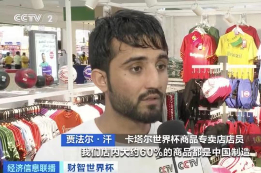 cctv节目中报到:专卖店60%的商品来自中国!而预计到了世界杯比赛开始,会有更多的中国元素去到世界杯舞台——唯独没有中国男足——期待我们中国男足国家队,下次世界杯不要缺席!