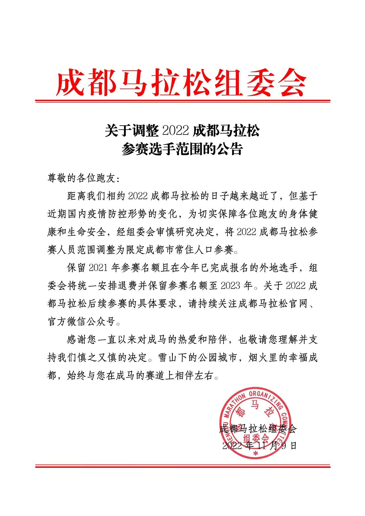 成都马拉松组委会今晚发布消息,基于近期国内疫情防控形势的变化,为切实保障各位跑友的身体健康和生命安全,经组委会审慎研究决定,将2022成都马拉松参赛人员范围调整为限定成都市常住人口参赛。保留2021年参赛名额且在今年已完成报名的外地选手,组委会将统一安排退费并保留参赛名额至2023年。关于2022成都马拉松后续参赛的具体要求,请持续关注成都马拉松官网、官方微信公众号。