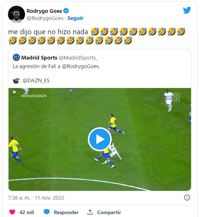 而故事并没有就此结束,在社交媒体上罗德里戈转发了一段视频并写道:“他跟我说他什么也没做。”他还同时配上了大量笑哭的表情。